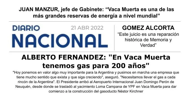 La diputada nacional del Frente de Todos (FdT) por Neuquén destacó que el presidente Alberto Fernández visitará hoy el yacimiento Loma Campana de YPF en Vaca Muerta, provincia de Neuquén, para dar comienzo a la construcción del gasoducto Néstor Kirchner.
