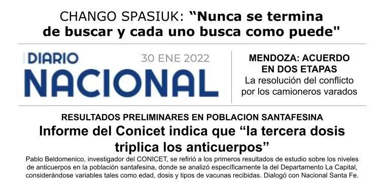 LT 14 Santa Fe - RESULTADOS PRELIMINARES EN POBLACION SANTAFESINA: Informe del Conicet indica que “la tercera dosis triplica los anticuerpos”