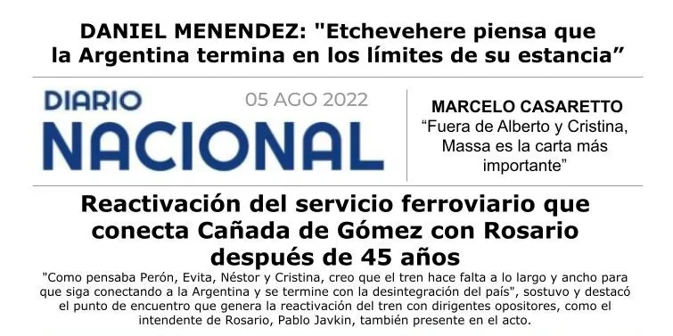 Al participar, junto al gobernador Omar Perotti y los ministros Sergio Massa (Economía) y Alexis Guerrera (Transporte), de la reactivación del servicio ferroviario que conecta Cañada de Gómez con Rosario después de 45 años, en la provincia de Santa Fe, el Primer Mandatario abogó por la unidad de los argentinos.