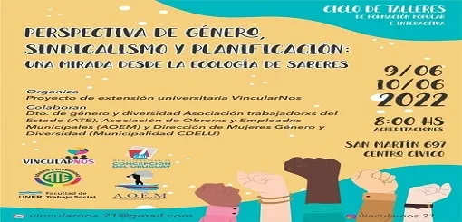 Maximiliano Musto, director del Proyecto de extensión “VincularNos” de la Facultad de Trabajo social de UNER Paraná, indicó en LT11 que el ciclo de talleres de Formación Popular e interactiva se desarrollaran los días 9 y 10 de junio en el Centro Cívico. Los mismos son el resultado de un trabajo de articulación y dialogo que viene desarrollando la Facultad desde fines del 2021 con el departamento de Genero de ATE; con AOEM, con la Dirección de mujeres, Género y Diversidades del Municipio y concejales.