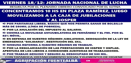 Gimena Garcia es integrante de la Comisión Directiva de Agmer Uruguay por la Fuentealba y dijo en LT11 "convocamos a esta Jornada Nacional de Lucha para este viernes 18/12 a las 10 de la mañana en Plaza Ramírez, para luego movilizar a la caja de jubilaciones y al IOSPER en un claro rechazo al ajuste brutal contra las/los trabajadores.