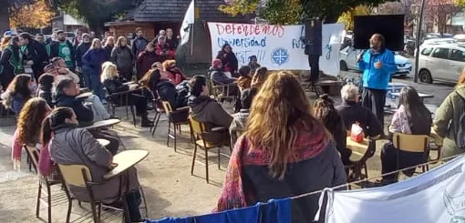 Cientos de vecinos y vecinas se concentraron en la plaza principal de San Martín de los Andes para pronunciarse en defensa de las universidades públicas tras la convocatoria a una clase abierta convocada por la comunidad educativa del asentamiento de la Universidad Nacional del Comahue.