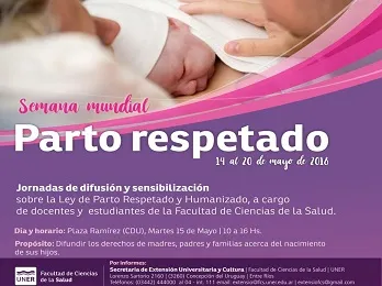 Se hablará sobre la Ley de Parto respetado y humanizado a cargo de  docentes y estudiantes de la Carrera de  Licenciatura Binacional en Obstetricia de la Facultad de ciencias de la Salud. El propósito  será difundir los derechos de madres, padres y familiar acerca del nacimiento de sus hijos. Esta actividad será mañana de 10 a 16 en Plaza Ramirez.